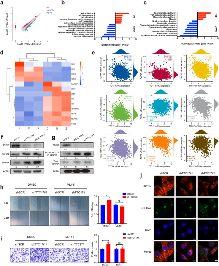 a Profile of DEGs (logFC > 1.5, FDR < 0.05) between TTC17-knockout MDA-MB-231 cells and control cells. b Enrichment of GO biological processes for up- and downregulated genes. c Enrichment of KEGG pathways for up- and downregulated genes. d Heatmap of key molecules in the RAP1 signaling pathway enriched by DEGs described in Fig. 4a. e mRNA expressional correlation of TTC17 with members of the RAP1/CDC42 cascade in breast cancer, including RAP1A, RAP1B, CDC42, MAP2K6, RHOA, ITGB1, ITGB2, ACTB, and ACTG1. f, g Western blot analysis of RAP1/CDC42 signaling activation in MDA-MB-231 cells with or without TTC17 knockdown by increased RAP1A, CDC42 (f), and RAP1A-GTP (g). h, i Representative images and quantitative analysis of wound healing assays (h) and Transwell invasion assays (i) using TTC17-silenced MDA-MB-231 cells treated with the CDC42 inhibitor ML141 and their counterparts. Scale bars, h 500 μm; i 200 μm. j Representative immunofluorescence images of actin cytoskeleton and Golgi morphology in MDA-MB-231 cells with TTC17 silencing or scramble control. Scale bar, 10 μm. *P < 0.05, **P < 0.01, ***P < 0.001. DEGs, differentially expressed genes; FDR, false discovery rate; GO, Gene Ontology; KEGG, Kyoto Encyclopedia of Genes and Genomes; BRCA, breast invasive carcinoma