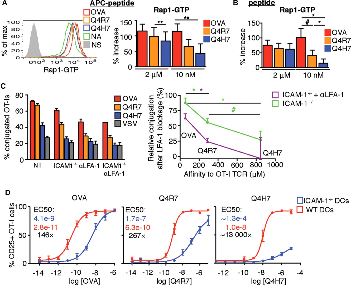 Signaling induced by low-affinity antigens is relatively more dependent on LFA-1 in comparison to high-affinity antigens. (A) DDAO+ OT-I T cells were activated by mixing with WT splenocytes preloaded with 2 μM or 10 nM peptide for 2 h. (B) OT-I T cells (5 × 106 /mL) were activated by addition of 2 μM or 10 nM peptide for 90 min. (A and B) The level of GTP-bound Rap1 was analyzed by flow cytometry. Statistical significance was calculated using onetailed paired t-test; data are shown as mean+SEM from single samples pooled from n = 3 (A) or n = 5 (B) independent experiments. (C) CFSE+ OT-I T cells were mixed with DDAO+ WT or ICAM-1−/− splenocytes preloaded with a particular antigenic peptide (1 μM) in the presence or absence of 10 μg/mL anti-LFA-1 antibody. The percentage of T cells conjugated with APCs was determined by flow cytometry (left). Data shown as mean + SEM of single samples pooled from n = 3 independent experiments. The relative level of conjugation under LFA-1 blockage was calculated as a ratio (%conjugated cognate peptide LFA-1 blockage – % conjugated VSV control LFA-1 blockage) / (%conjugated cognate peptide untreated – % conjugated VSV control untreated) and plotted versus the antigen affinity (right) 4. Data shown as mean + SEM. Statistical significance was calculated using two-tailed paired t-test. (D) OT-I cells were activated with antigen pulsed BMDCs cells overnight. The percentage of CD25+ cells from CD8+ cells is shown. Data shown as mean ± SEM from single samples pooled from n = 4 independent experiments. EC50 for WT (red) and ICAM-1−/− DCs (blue) as well as their ratio (black) is shown. #p<0.1, *p<0.05, **p<0.01.