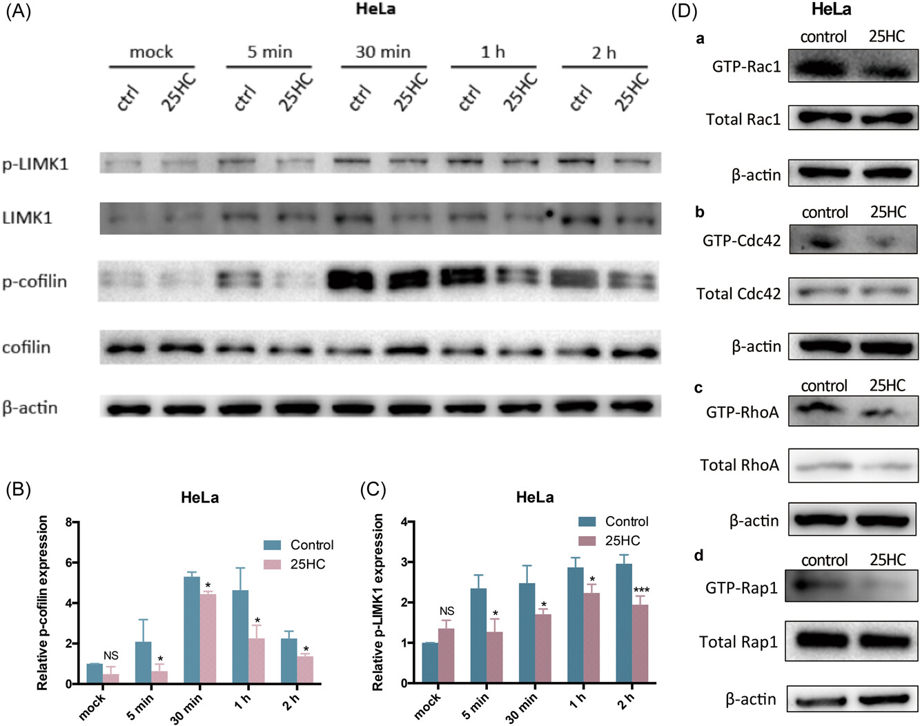 (A) Proteins of HeLa cells were collected at different time points post-HPV16 PsV infection for Western blot evaluation. Phosphorylated LIMK1 was increased by HPV inoculation. Cofilin phosphorylation also increased within 5 min postinfection, but decreased after 2 h. However, in 25HC-treated cells, at each time point, phosphorylation levels of LIMK1 and cofilin were lower than those observed in the control group. β-actin was used as loading control. (B)(C) Grayscale values of the Western blots were evaluated. Relative intensity of p-cofilin and p-LIMK1 was normalized to β-actin and standardized relative to mock of the control group. The differences between control group and 25HC group at each time point were calculated. Data are shown as the mean ± SD. (NS, non-significance; *p < 0.05; **p < 0.01; ***p < 0.001). (D) Equal amounts of HeLa cell lysates in the absence or presence of 25HC were used to capture the GTP-bound form of Rho GTPases (Rac1, Cdc42, and RhoA) by affinity precipitation with GST-PBD beads and capture GTP-bound Rap1 by active Rap1 GTP monoclonal antibody. The active GTP-bound forms of Rac1, Cdc42, RhoA, and Rap1 were reduced by 25HC treatment.