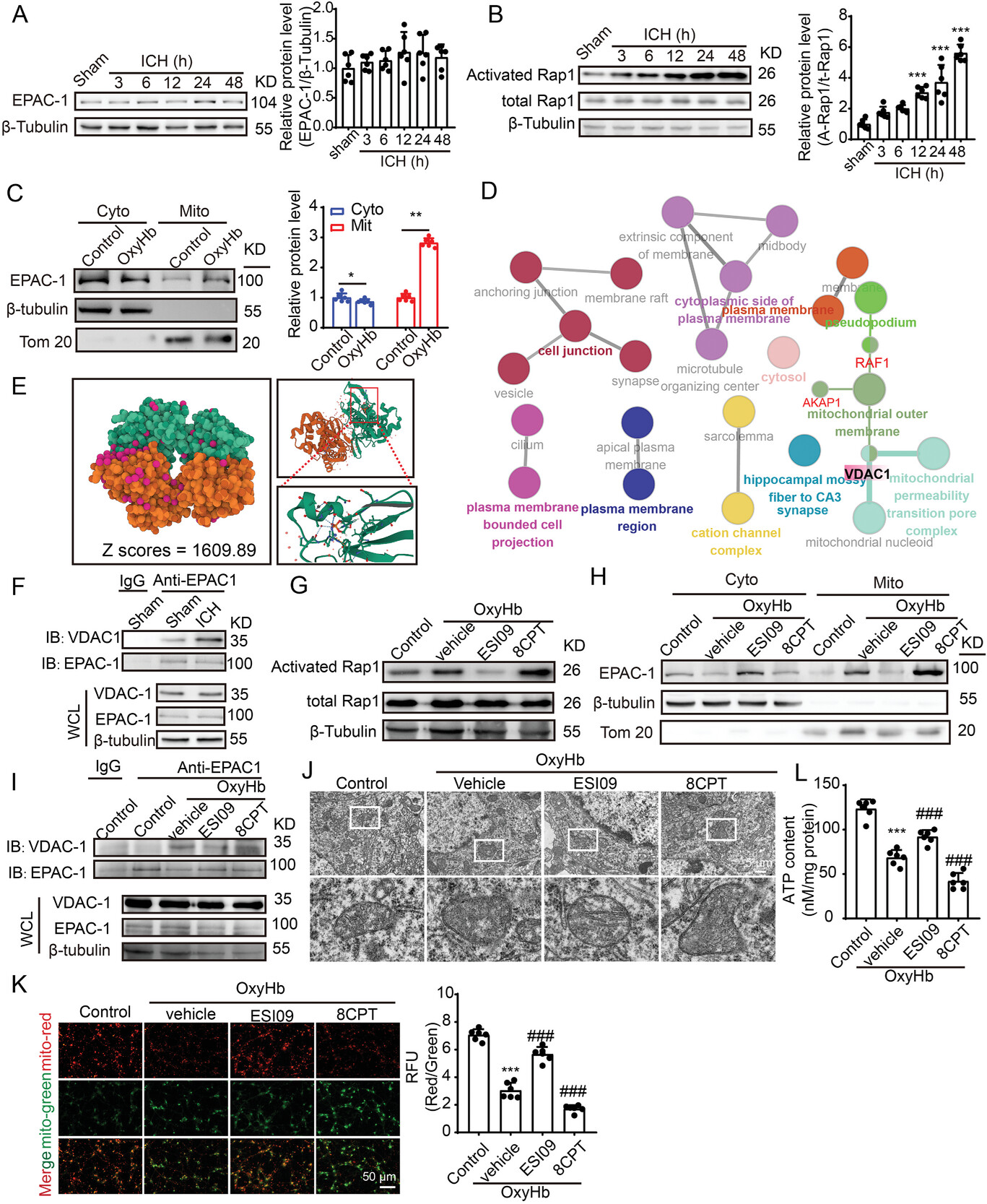 A) Samples of cortex surrounding the hematoma in mice were collected at 3, 6, 12, 24, and 48 h post-ICH induction. The protein levels of EPAC-1 were assessed via western blot analysis, and the alterations in expression were quantified. β-Tubulin served as loading controls, with a sham group being normalized to a value of 1.0 for accurate comparisons (n = 6). B) EPAC-1 activation was assessed by measuring the levels of activated Rap1-GTP using a Rap1 Activation Assay Kit. β-Tubulin served as loading controls, with each sham group being normalized to a value of 1 for accurate comparisons n = 6. C) Neurons underwent a 12 h stimulation with 10 µm OxyHb. Subsequently, mitochondria and cytoplasm were isolated, and the protein levels of EPAC-1 in both compartments were evaluated using western blot analysis. β-Tubulin and Tom20 served as loading controls, with each control group being normalized to a value of 1 for accurate comparisons, n = 6. D) Protein-protein interaction (PPI) network was queried from the STRING database (https://string-db.org), followed by functional protein enrichment analysis conducted through Cytoscape and ClueGO. E) Rigid protein-protein docking (ZDOCK) was conducted to investigate the relationship between EPAC-1 and VDAC1. The PDB format of the protein structural domain was obtained from the Protein Data Bank (PDB) at http://www.rcsb.org/. The ZDOCK module was used to identify docking sites and calculate ZDOCK scores. F) Cortex samples surrounding the hematoma in mice were collected from sham and ICH 24 h groups, followed by co-immunoprecipitation to validate the interaction between EPAC-1 and VDAC-1. G,H) Following stimulation with 10 µm OxyHb for 12 h, neurons were treated with the EPAC-1 inhibitor ESI09 (10 µm) or activator 8CPT (10 µm) for 24 h. The levels of activated Rap1-GTP were detected using a Rap1 Activation Assay Kit (G), while EPAC-1 protein levels in both compartments were assessed via western blot analysis (H). Co-immunoprecipitation was used to detect the interaction between EPAC-1 and VDAC-1 I), and mitochondrial structures were examined by means of transmission electron microscopy with a scale bar of 5 µm J). The ATP content was quantified L), and mitochondrial membrane potential (MMP) was measured by JC-1 staining K). All data are presented as mean ± SD. Statistical significance was determined using one- or two-way ANOVA with Tukey’s multiple comparisons tests (n = 6, ***p < 0.0001 vs control/ sham group; ###p < 0.0001 vs Vehicle group).