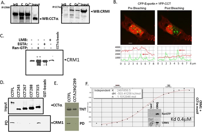(C) Direct binding of recombinant CRM1 to purified CCTα. Binding reactions were performed using recombinant CRM1 with purified CCTα-conjugated to Talon resin in the presence or absence of RanGTP, LMB, or EGTA, followed by pull-down assays. The results were visualized by immunoblot analysis. (D, E) Identification of a CRM1-docking site within CCTα. GST-fused CCTα mutants were expressed in MLE cells (D, top). Cell lysates were then processed for GST-pull-down assays, followed by immunoblotting (bottom). (E) CCTα full length and an internal deletion mutant were synthesized using TnT (top), followed by pull-down assays using CRM1-conjugated beads (bottom). The beads were prepared using His-tagged CRM1 protein synthesized by TnT. CCTα full length and mutants bound to CRM1 beads were detected using immunoblotting. The results were visualized by immunoblot analysis (D) or autoradiography (E). (F) ITC binding analysis of CRM1 and a peptide (LEMFGPEGAL) encoding a CaMKI-binding motif within CCTα. The insert demonstrates the enrichment of CRM1 fraction with RanGTP. Data in each panel represent n = 2 or 3 separate experiments. *p < 0.05 vs. control.