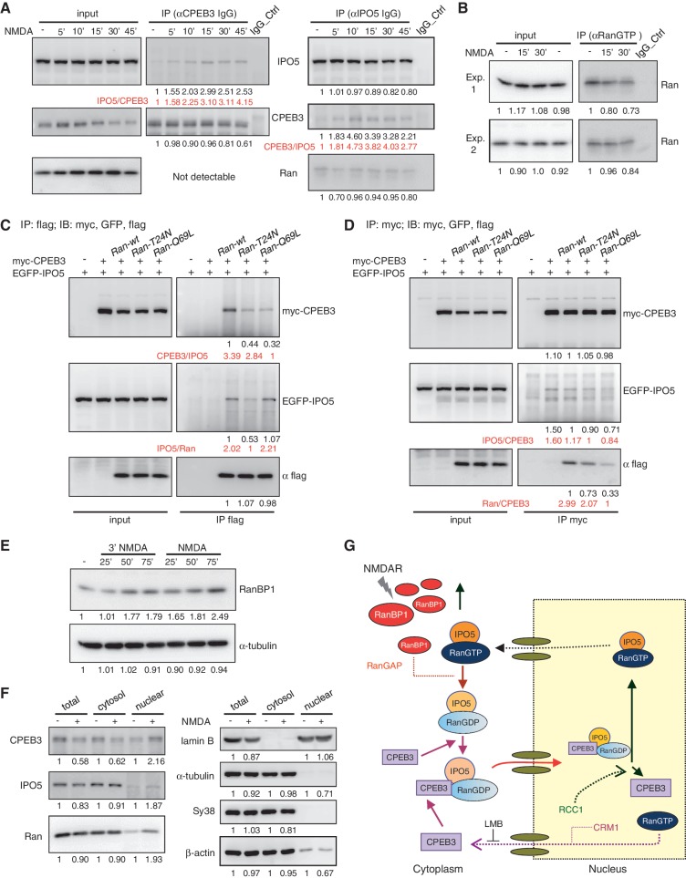 (A) Neurons stimulated with 3 min of NMDA and then incubated for the denoted time were used for IP with CPEB3 and IPO5 IgGs, followed by immunodetection with IPO5, CPEB3 and Ran antibodies. The intensities of immunodetected signals analysed by the ImageJ software are displayed as relative ratios at the bottoms of blots. The ratios of the co-precipitated target versus the immunoprecipitated protein (IPO5/CPEB3 or CPEB3/IPO5) are shown in red. (B) The cytoplasmic fraction isolated from neurons treated with ± NMDA was precipitated with the RanGTP antibody and immunoblotted with Ran antibody. (C and D) HeLa cells expressing myc-CPEB3, EGFP-IPO5 along with Ran-wt, T24N or Q69L mutant were pulled down with (C) flag or (D) myc antibodies. The precipitated substances were probed with GFP, myc and flag antibodies. (E) Neurons stimulated with a pulse of NMDA or NMDA for the indicated times were harvested for western blotting using RanBP1 and tubulin antibodies. (F) The nuclear and cytosol lysates fractionated from neurons treated with ± NMDA for 30 min were used for immunoblotting. (G) Schematic model of NMDA-induced nuclear import of CPEB3. NMDAR signaling increases RanBP1 expression, combined with RanGAP to stimulate Ran’s GTPase activity. Consequently, the IPO5-RanGDP complex can bind to CPEB3 and deliver CPEB3 to the nucleus. After nuclear import, a high RanGTP concentration and RCC1 in the nucleus triggers the release of CPEB3 from the ternary complex because RanGTP impairs the interaction between IPO5 and CPEB3. The nuclear export of CPEB3 is mediated by CRM1.