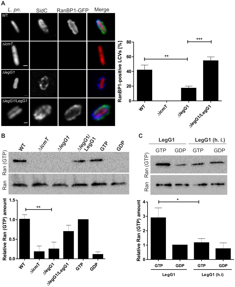 L. pneumophila wild-type but not ΔlegG1 activates Ran on LCVs.