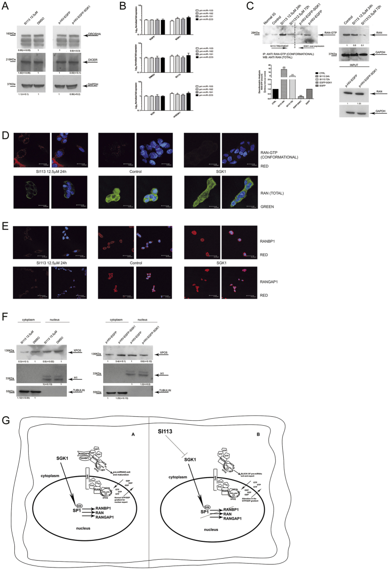(A) Western blot of proteins from HUH7 cells, treated with SI113 (12.5 μM; 72 h) or vehicle (left), or transduced with EGFP-SGK1 or EGFP (right). Cell extracts were separated, blotted and decorated by DROSHA, DICER and GAPDH antibodies. (B) Quantitative RT-PCR analysis of pri-microRNAs in HUH7 cells stably over-expressing EGFP-SGK1 or EGFP (upper panel), in SI113-treated HUH7 and control cells (middle panel), in shSGK1 and shScrl HUH7 cells (bottom panel). The assay was performed as above. Results are represented as Log10 of fold expression ± SD and evaluated using t-test. (C) Immunoprecipitation of RAN-GTP from HUH7 cells treated with SI113 (12.5 μM; 24 h and 72 h) or vehicle or transduced with a lentivirus encoding p-HIV-EGFP or p-HIV-EGFP-SGK1. Immunoprecipitation was performed as described in methods. The immunoprecipitates (left) and the corresponding total extracts (right) were blotted and decorated by anti-Ran total goat polyclonal antibodies. GAPDH was used as a loading control (right). (D) Representative immunofluorescence analysis of HUH7 cells either treated with SI113 (12.5 μM) or over-expressing SGK1 (pcDNA4-TO-SGK1) compared with control cells. Samples were incubated with either a conformational Active-RAN monoclonal antibody or with an anti-Ran total goat polyclonal antibody and DAPI (0.05% μg/ml1). Since no variation in fluorescence was observed between the different experimental controls; only one control is presented in the panel. (Leica TC SP2 microscope with a x63 objective and Leica confocal software). (E) HUH7 cells treated as above, were stained with either an anti-RANBP1 goat polyclonal antibody or an anti-RANGAP1 monoclonal antibody and DAPI (0.05% μg/ml).