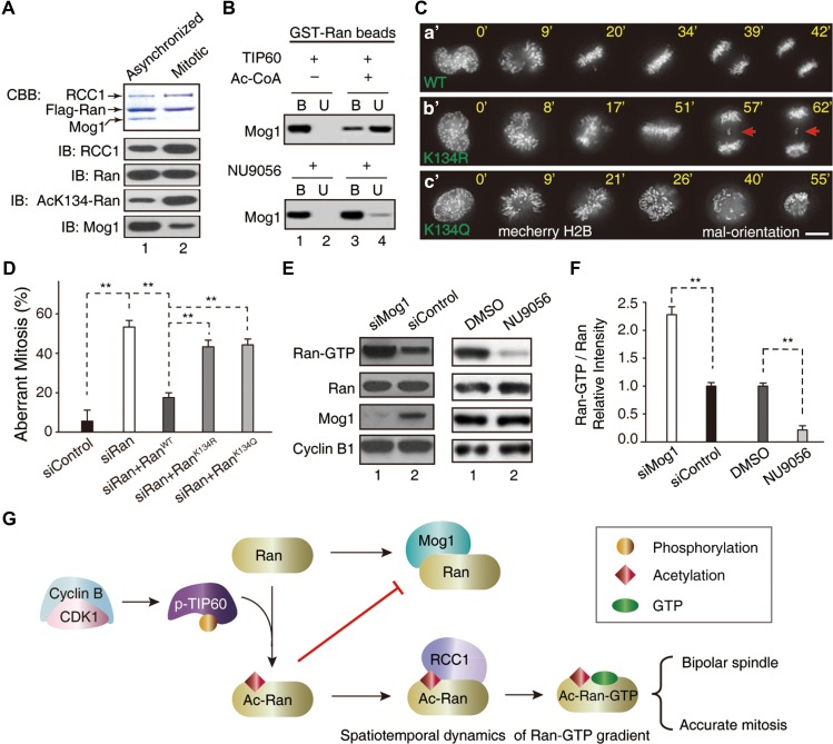 (A) Flag-Ran immunoprecipitates from mitotic and asynchronized HeLa cells were analyzed by western blot with indicated antibodies. (B) Purified GST-Ran was incubated with TIP60 in the presence or absence of Ac-CoA or TIP60 inhibitor (NU9056) followed by addition of Mog1. The binding between Ran and Mog1 was analyzed by western blot. (C) Real-time imaging shows that expression of non-acetylatable RanK134R resulted in chromosome segregation error (b’, arrows). Scale bar, 10 μm. (D) Statistical analyses of efficiency of exogenously expressed siRNA-resistant RanWT, RanK134Q, and RanK134R in rescuing the mitotic defects in Ran-suppressed cells (mean ± SEM, n = 16, siControl; n = 13, siRan; n = 18, siRan + RanWT; n = 18, siRan + RanK134R; n = 16, siRan + RanK134Q, **P < 0.01). (E and F) Suppression of Mog1 promoted the level of Ran-GTP and inhibition of TIP60 reduced the level of Ran-GTP in mitosis. Western blotting analyses of Ran-GTP levels in Mog1 suppressed and TIP60-inhibited HeLa cells in mitosis, respectively (**P < 0.01). (G) Working model accounting for acetylation-elicited tuning Ran effector binding for chromosome segregation.