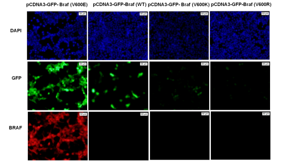 Immunofluorescence of cell expressing BRaf protein with BRaf(V600E) antibody . HEK293T cells were transfected with pCDNA3-GFP- B-Raf( V600E )plasmid,pCDNA3-GFP- B-Raf( WT )plasmid, pCDNA3-GFP- B-Raf( V600K )plasmid,pCDNA3-GFP- B-Raf( V600R )plasmid, pCDNA3-GFP- B-Raf( V600A )plasmid,pCDNA3-GFP- B-Raf( V600D ) plasmid, pCDNA3-GFP-B-Raf(V600M)plasmid, or pCDNA3-GFP-B-Raf(V600G)plasmid, then fixed and stained with B-Raf(V600E) monoclonal antibody (货号 26039).