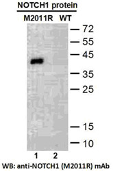 Western blot analysis of recombinant NOTCH1(M2011R) and wild type proteins. Purified His-tagged NOTCH1(M2011R) protein (lane1) and corresponding wild type protein (lane2) were blotted with NOTCH1(M2011R) monoclonal antibody (货号26444). |