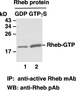 Purified Rheb proteins were immunoprecipitated after treated with GDP (lane 1) or GTPγS (lane 2). Immunoprecipitation was done with the Rheb-GTP monoclonal antibody (Cat. No. 26910). Immunoblot was with an Rheb rabbit polyclonal antibody (Cat. No. 21098). |